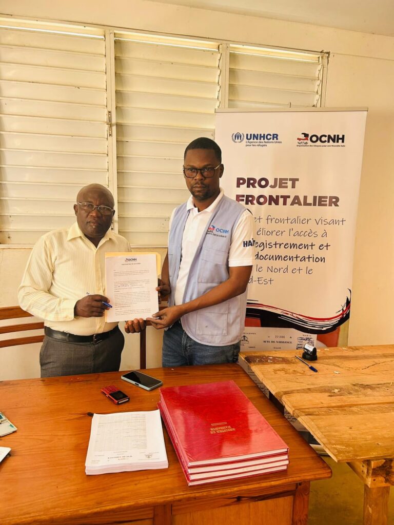 L’Organisation des Citoyens pour une Nouvelle Haïti (OCNH) a signé, ce vendredi, un protocole d’accord avec le Bureau de l’état civil de Mont-Organisé afin de faciliter l’enregistrement des naissances dans les zones frontalières. L’initiative s’inscrit dans un projet soutenu par le Haut-Commissariat des Nations unies pour les Réfugiés, visant à améliorer l’accès à la documentation dans les départements du Nord et du Nord-Est.