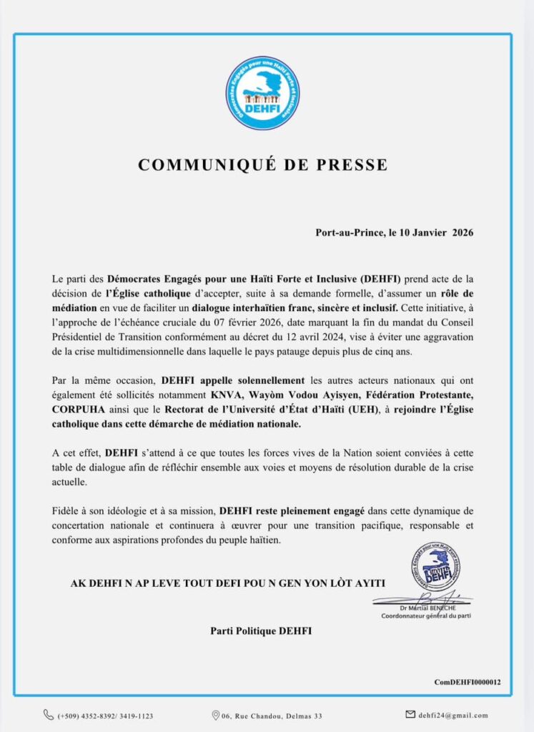 Le parti politique DEHFI a exprimé son soutien à l’initiative de l’Église catholique visant à jouer un rôle de médiateur dans un dialogue national entre Haïtiens. Selon le parti, cette démarche est particulièrement urgente alors que le mandat du Conseil présidentiel de transition (CPT) prend fin le 7 février 2026.