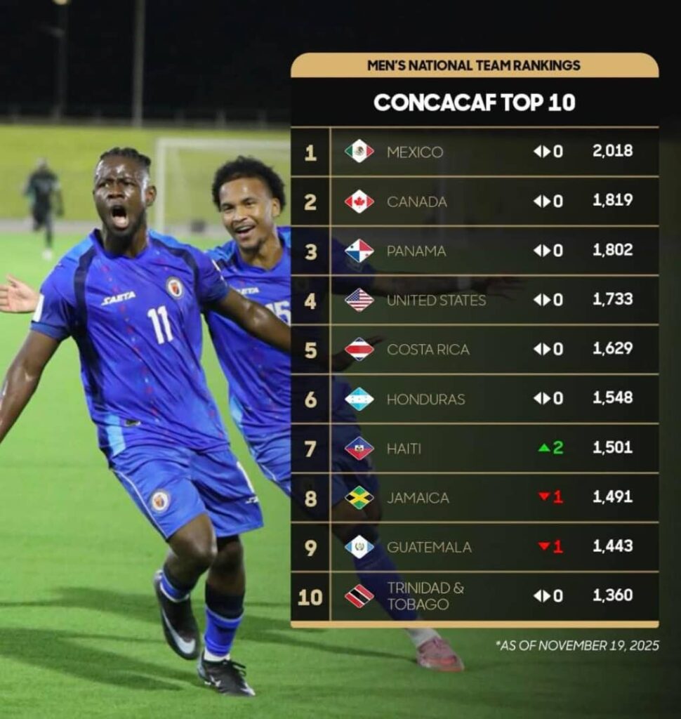La sélection nationale haïtienne continue d’impressionner dans la région. Selon la mise à jour officielle publiée le mardi 25 novembre 2025, Haïti gagne deux places dans le classement de la CONCACAF et grimpe au 7ᵉ rang, passant devant la Jamaïque. Les Grenadiers deviennent ainsi la nation la mieux classée de toute la zone Caraïbes.