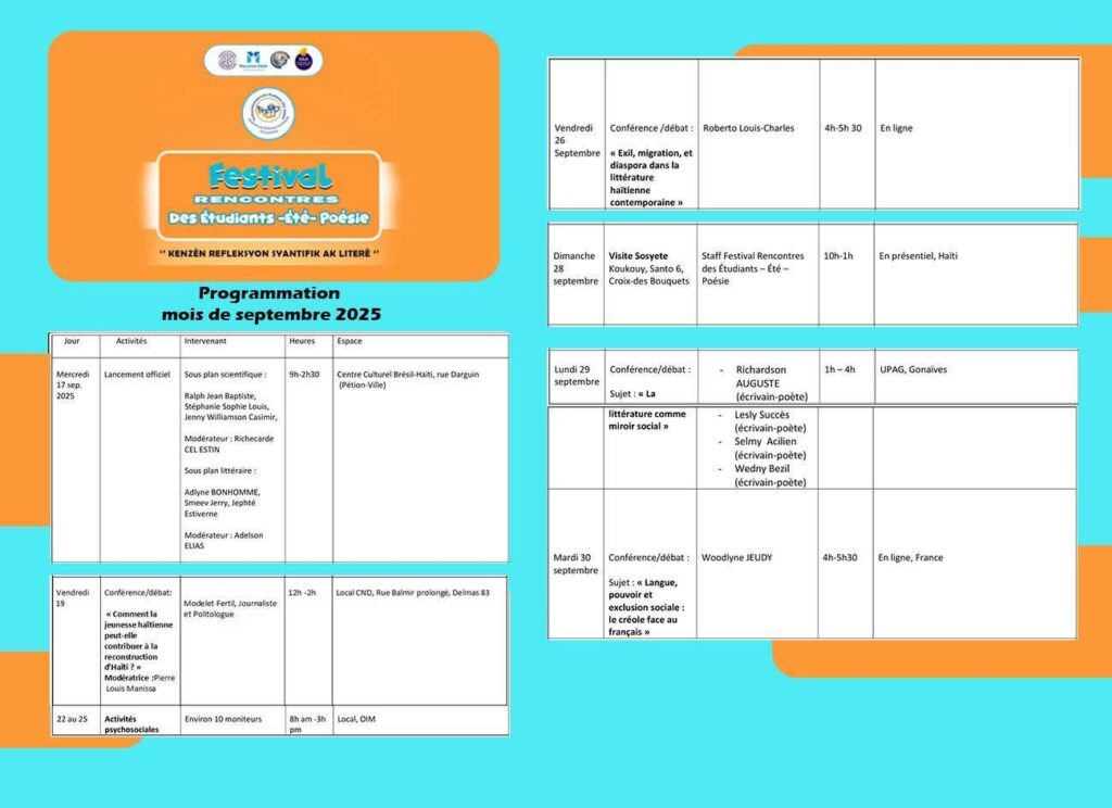 Organisé par Laviwonndede, organisation littéraire et artistique, l’événement bénéficie du soutien de plusieurs partenaires : Mouvman Ekilib (ME), Association Café Philo Haïti (ACPH), Gouvernement Jeunesse d’Haïti (GJH), et Laviwonndede Agence Littéraire et Artistique (LALA)