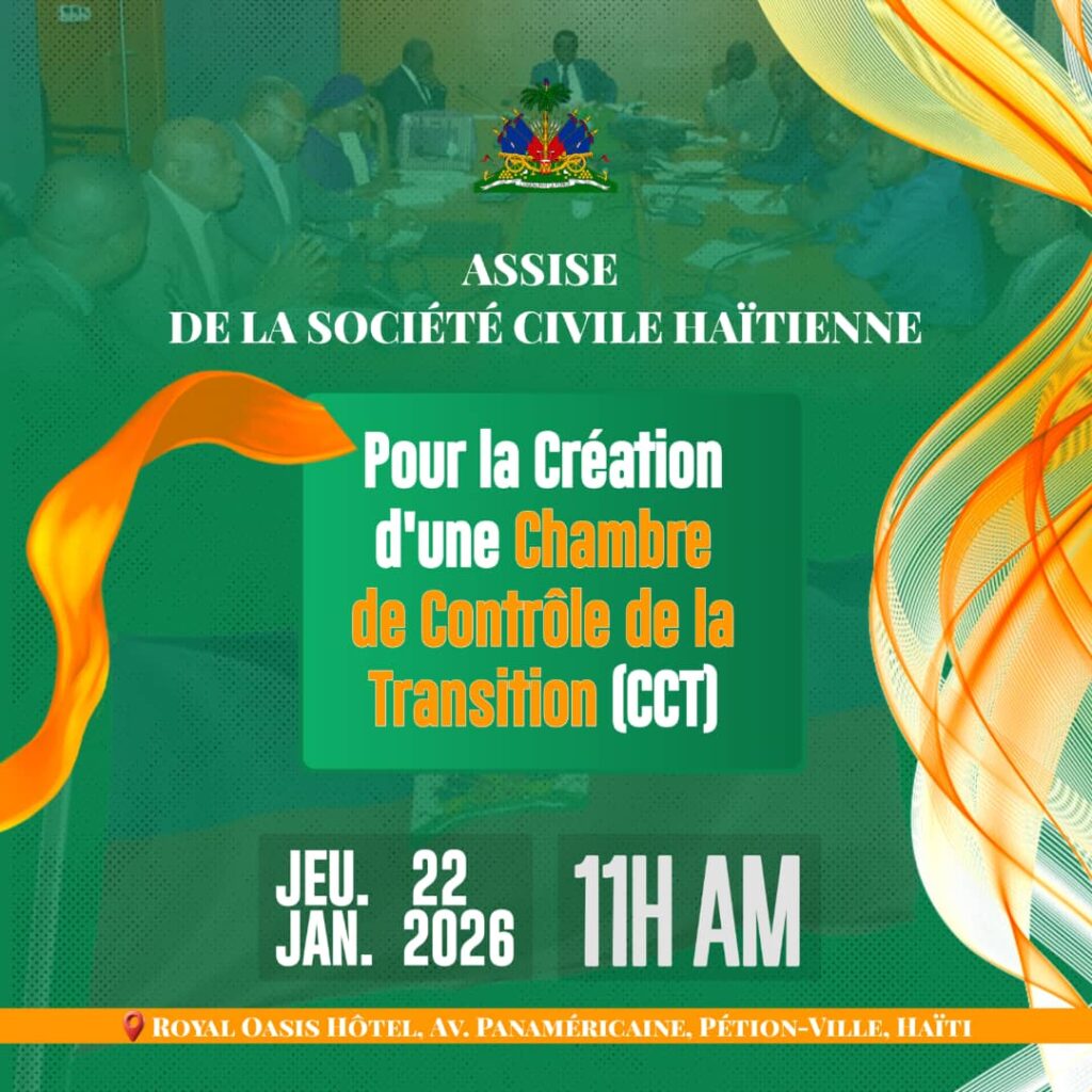 Des organisations de la société civile sont invitées à participer, le 22 janvier 2026, à une assise prévue à l’Hôtel Oasis, à Pétion-Ville, en vue d’analyser, d’adopter et de signer la Constitution de la Chambre de Contrôle de la Transition (CCT).