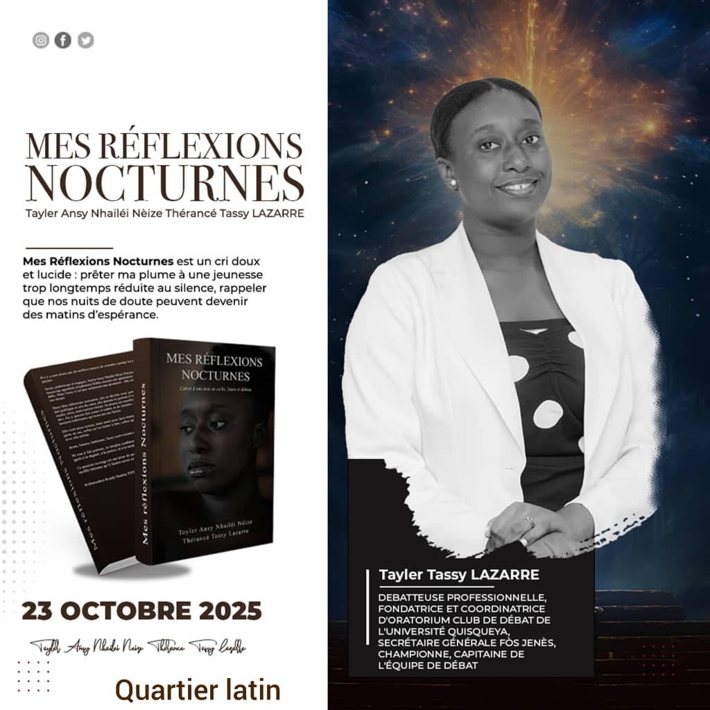 Lors d’une entrevue exclusive accordée à notre rédaction ce dimanche, l’étudiante en droit et figure montante de l’art oratoire universitaire, Tayler Ansy Nhaïléi Nèize Thérancè Tassy Lazarre, a présenté son premier ouvrage intitulé Mes Réflexions Nocturnes. Ce recueil, qu’elle décrit comme un cri de vérité et d’espérance, sera lancé le 23 octobre prochain au Quartier Latin, à Pétion-Ville, lors d’une vente-signature réunissant plusieurs artistes et poètes de renom.