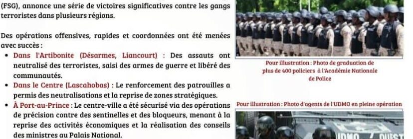 La Police nationale d’Haïti (PNH), en collaboration avec la Force de suppression des gangs (FSG), a annoncé ce mercredi une série de victoires significatives dans le cadre de ses opérations visant à démanteler les réseaux criminels qui sèment la terreur dans plusieurs régions du pays.