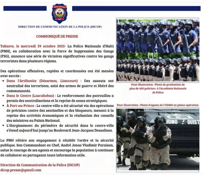 Les responsables sécuritaires saluent la collaboration de la population dans certaines localités, tout en réaffirmant leur engagement à poursuivre la lutte jusqu’à la neutralisation complète des groupes armés,peut on lire sur la page Facebook de la PNH.