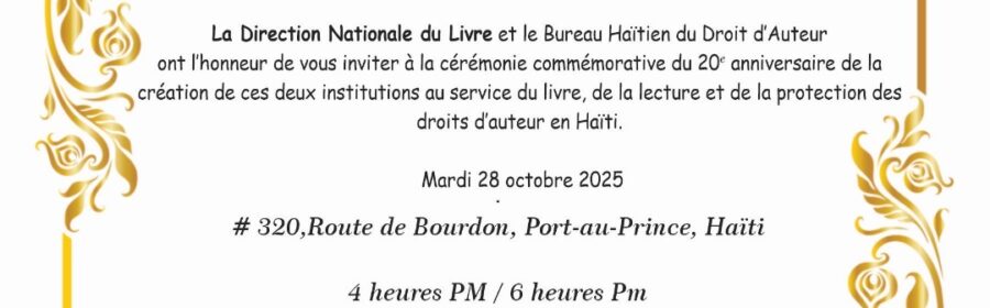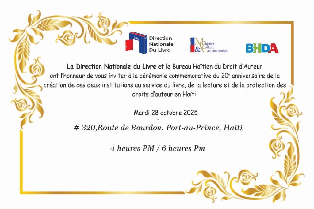 La Direction nationale du livre (DNL) et le Bureau haïtien du droit d’auteur (BHDA) célèbrent, ce 28 octobre, leur 20ᵉ anniversaire. Pour marquer ces deux décennies de travail consacré à la promotion du livre, de la lecture publique et de la culture de l’écrit, les deux institutions ont convié la presse écrite, parlée et télévisée à une grande journée de célébration.