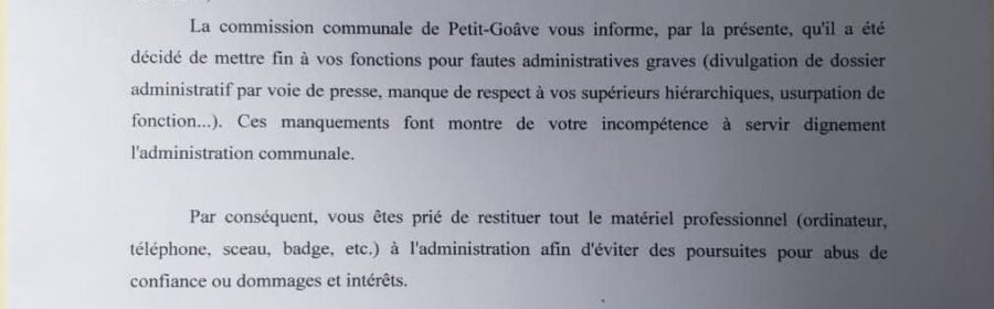 Petit-Goâve, 2 février 2026 .–Dans le document adressé à M. Toussaint, la commission communale cite notamment la « divulgation de dossier administratif par voie de presse », le « manque de respect envers vos supérieurs hiérarchiques » et l’« usurpation de fonction ». Ces manquements, indique la lettre, témoignent d’« une incompétence à servir dignement l’administration communale ».