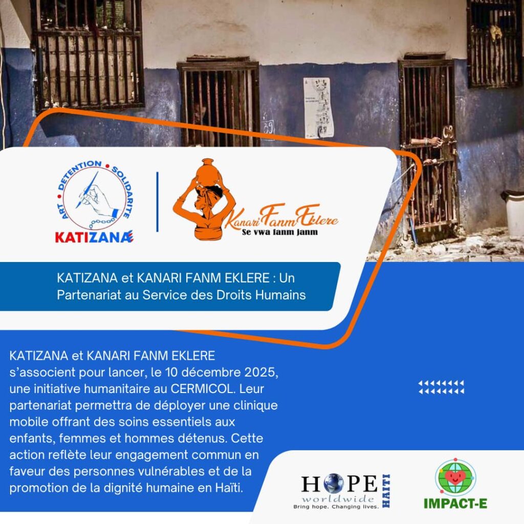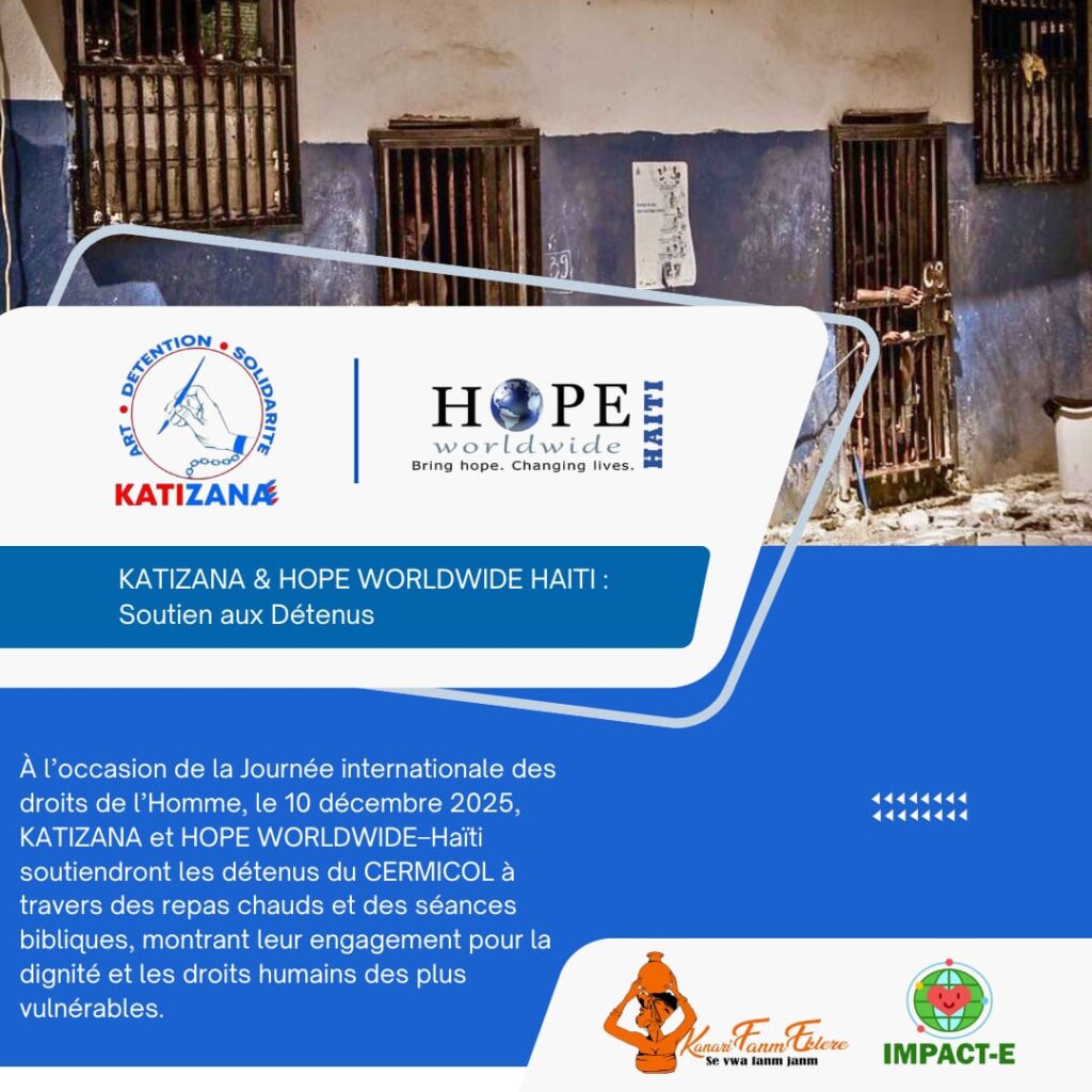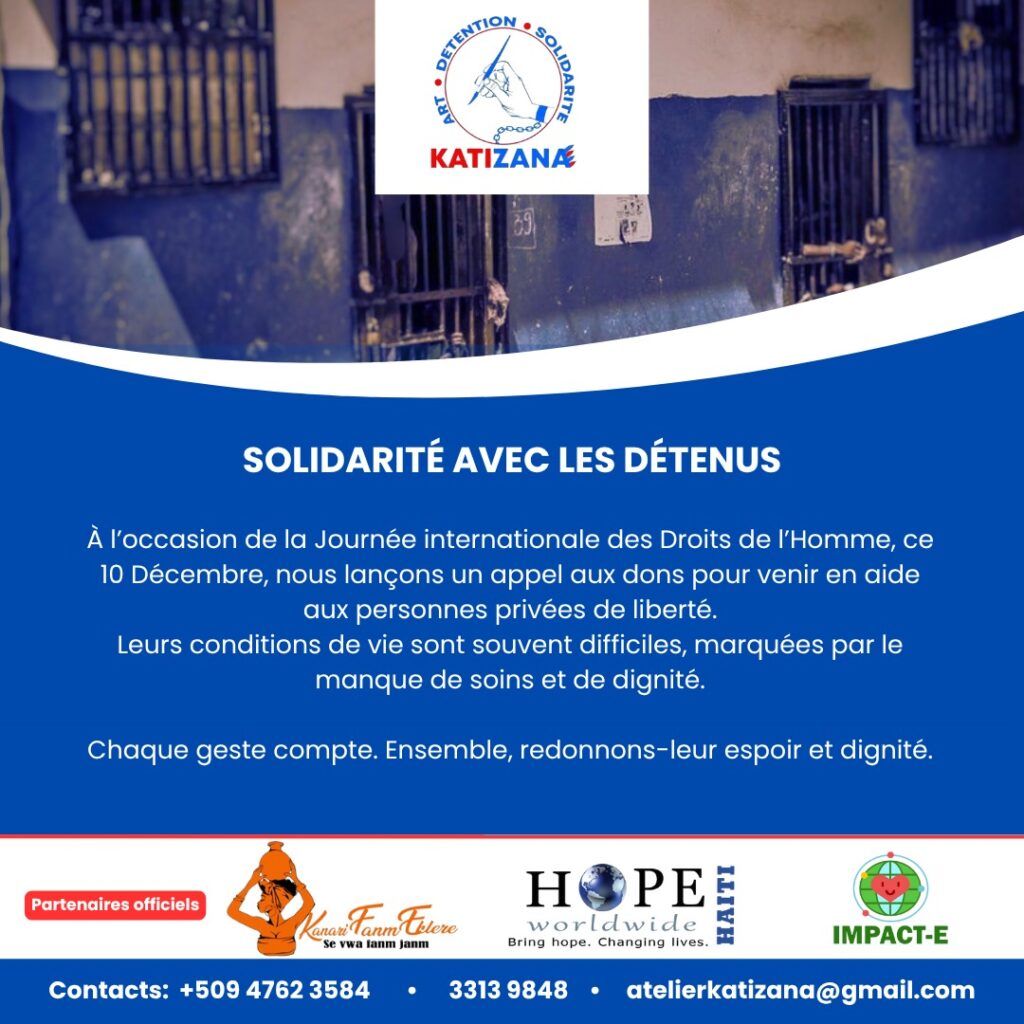 Pour marquer le 77e anniversaire de la déclaration universelle des droits de l’homme, KATIZANA organise, en collaboration avec KANARI FANM EKLERE, Hope Worldwide Haïti et IMPACTE, une journée spéciale de solidarité le 10 décembre prochain. Les détenus recevront des produits de toilette, bénéficieront d’une clinique mobile ainsi que d’activités culturelles et formatives.
