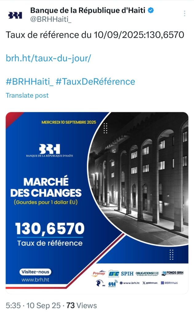 La BRH rappelle que le taux de référence est toujours disponible sur son site internet. Site: www.brh.ht et sur son compte X @BRHHaiti.