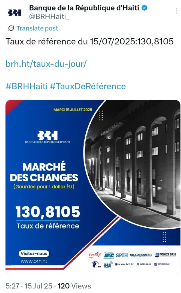 La BRH rappelle que le taux de référence est toujours disponible sur son site internet. Site: www.brh.ht et sur son compte X @BRHHaiti.