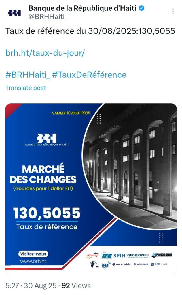 La BRH rappelle que le taux de référence est toujours disponible sur son site internet. Site: www.brh.ht et sur son compte X @BRHHaiti.