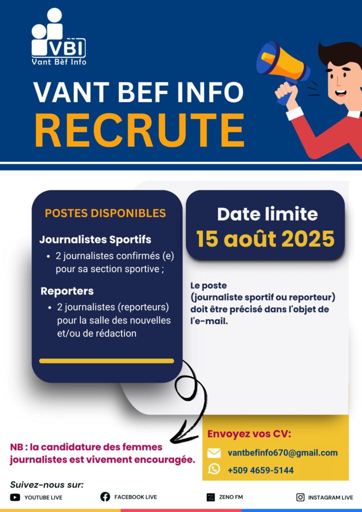 Dans le cadre du renforcement de sa salle des nouvelles, Vant Bèf Info lance un appel à candidatures pour le recrutement de deux reporters et deux journalistes sportifs passionnés et motivés.